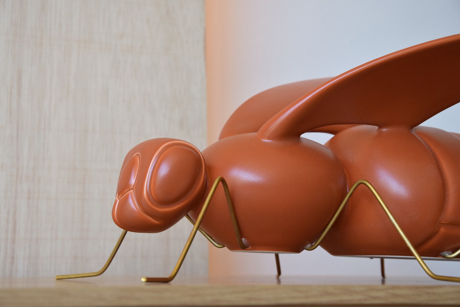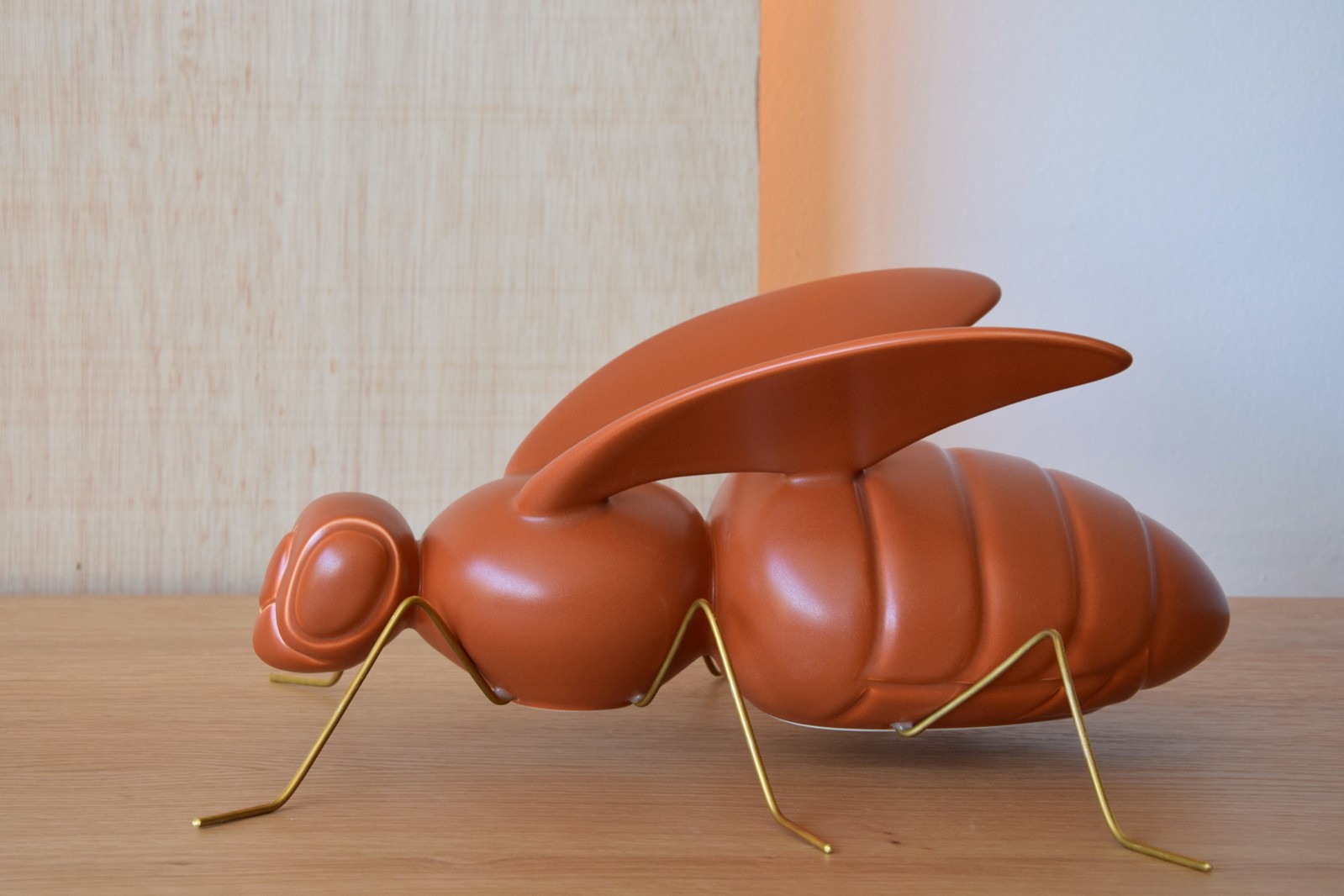 FIGURA DE ABEJA CON ALAS LEVANTADAS REALIZADA EN CERÁMICA COLOR TEJA ACABADO MATE. PATAS METAL DORADO ENVEJECIDO.