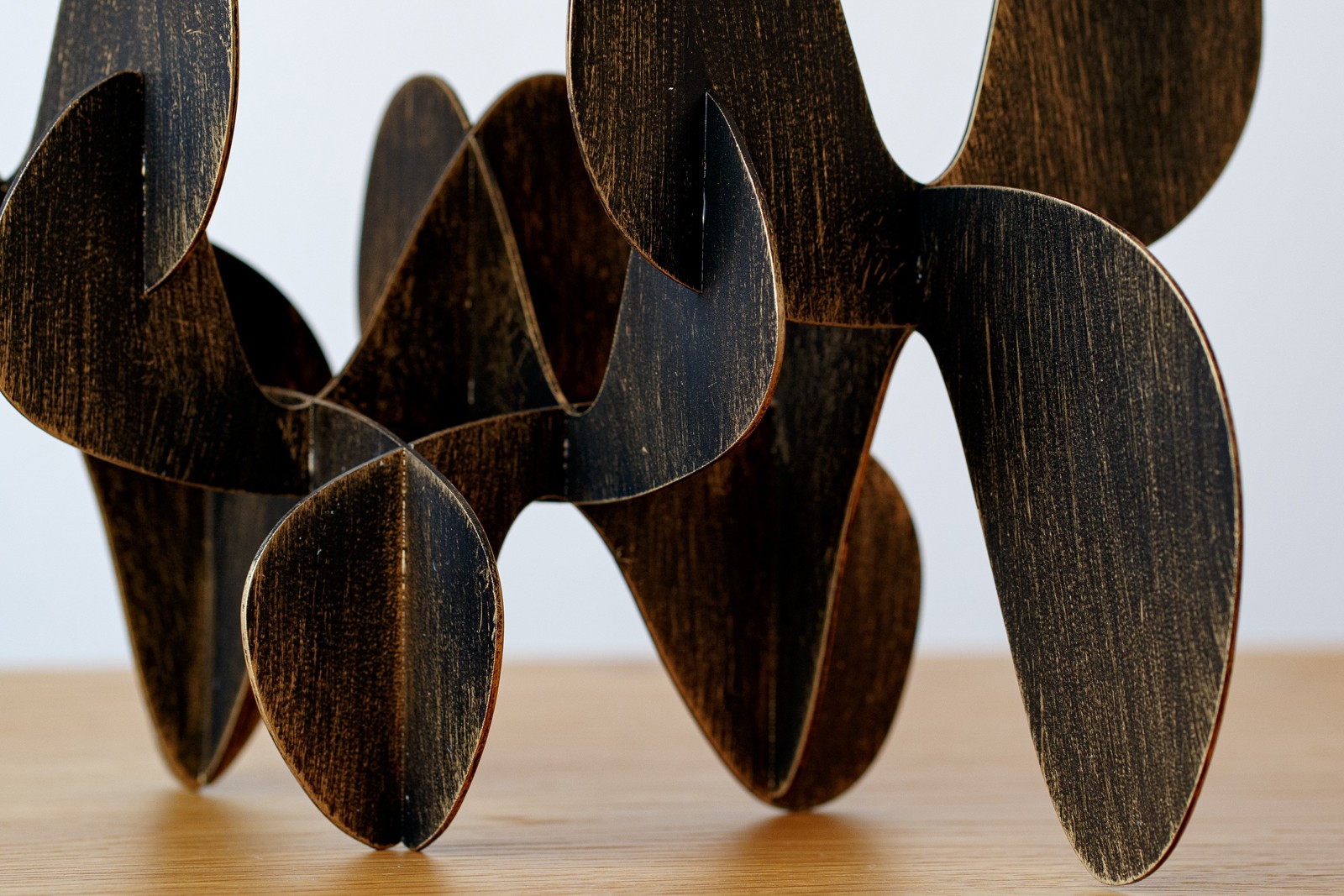 ESCULTURA REALIZADA EN METAL. COMO SI DE UN PUZLE SE TRATASE LAS DISTINTAS LÁMINAS DE METAL SE ENTRECRUZAN ENTRE SÍ GENERANDO UNA ORIGINAL PIEZA DE FORMAS ORGÁNICAS. SU COLOR EN NEGRO CON TOQUES EN ORO VIEJO APLICADO MEDIANTE LA TÉCNICA DEL CEPILLADO CON ACABADO IRREGULAR LA CONVIERTE EN UN ELEMENTO IDEAL PARA APORTAR CONTEMPORANEIDAD Y ELEGANCIA A CUALQUIER ESPACIO.-AL TRATARSE DE ACABADOS ARTESANALES QUE SE REALIZAN A MANO ES POSIBLE QUE EXISTAN VARIACIONES DE UNAS PIEZAS A OTRAS.