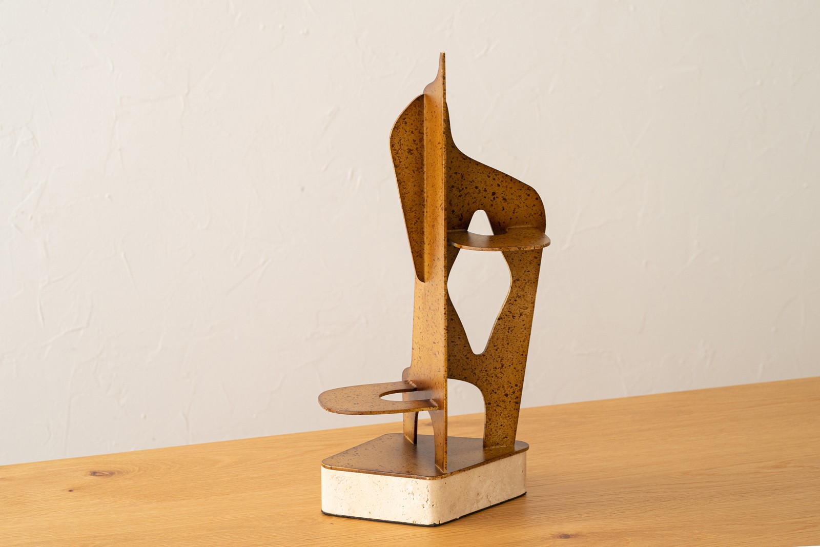 ESCULTURA ABSTRACTA REALIZADA EN METAL CON UN ACABADO CON TEXTURA SIMILAR AL ÓXIDO COMBINADA CON UNA BASE EN MÁRMOL TRAVERTINO NATURAL. PIEZA DE LÍNEAS CONTEMPORÁNEAS DE ESTÉTICA NATURAL GRACIAS A LOS TONOS CÁLIDOS Y A LAS CARÁCTERISTICAS DE LOS MATERIALES UTILIZADOS. DEBIDO A LAS CARACTERÍSTICAS PROPIAS DEL MARMOL TRAVERTINO PUEDE PRESENTAR POROS DE DISTISTOS TAMAÑOS Y DIFERENTES TONALIDADES. AL TRATARSE DE UN ACABADO ÓXIDO ARTESANAL PUEDE HABER VARIACIONES DE UNAS PIEZAS A OTRAS.