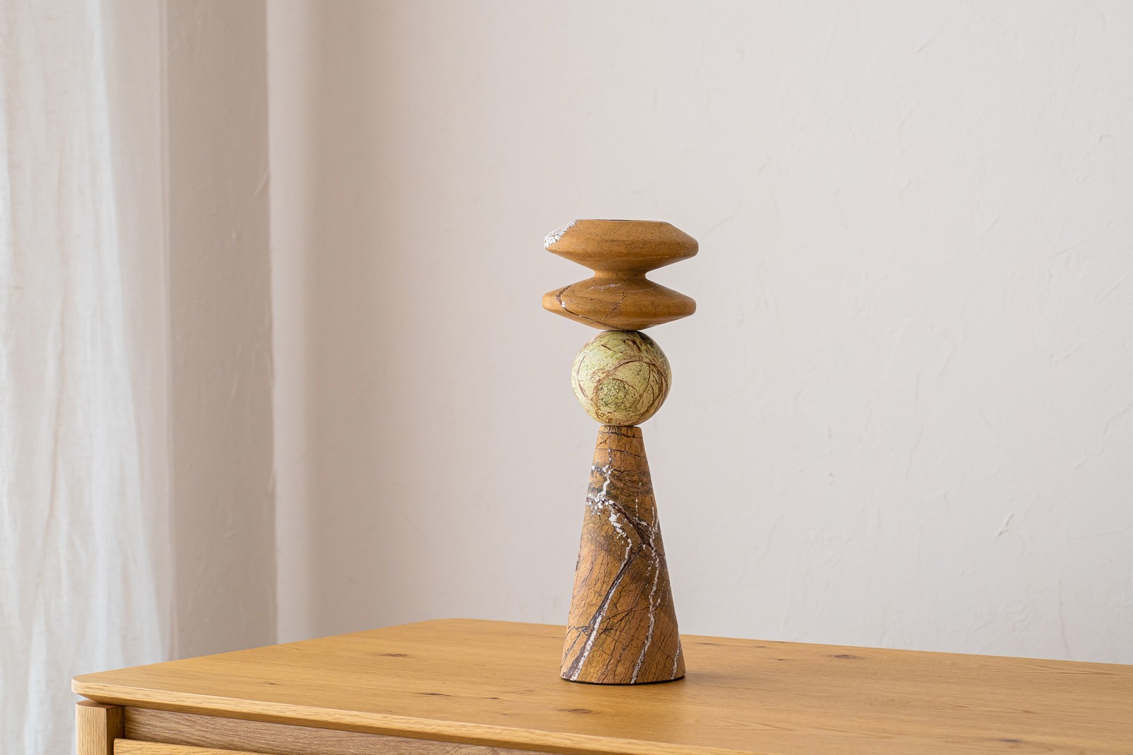 CANDELABRO CEIBE N1. CANDELABRO REALIZADO TOTALMENTE EN MÁRMOL NATURAL COMBINANDO LOS TONOS MARRONES Y VERDES. TAMAÑO GRANDE. LA BASE Y LA PARTE SUPERIOR DE LA PIEZA DE LÍNEAS GEOMÉTRICAS SE HAN REALIZADO EN UN MÁRMOL DE TONOS MARRONES CON VETAS EN GRANATE Y BLANCO QUE SE COMBINA CON EL MÁRMOL EN TONOS VERDES DE LA ESFERA QUE SIRVE DE CONEXIÓN ENTRE AMBAS PARTES. AL TRATARSE DE PIEDRAS NATURALES Y ACABADOS ARTESANALES PUEDE HABER VARIACIONES DE UNAS PIEZAS A OTRAS ASÍ COMO POROSIDADES EN EL MÁRMOL Y VETAS DE DISTINTAS TONALIDADES. ESTOS ASPECTOS REALZAN EL CARÁCTER NATURAL DE LAS PIEZAS.