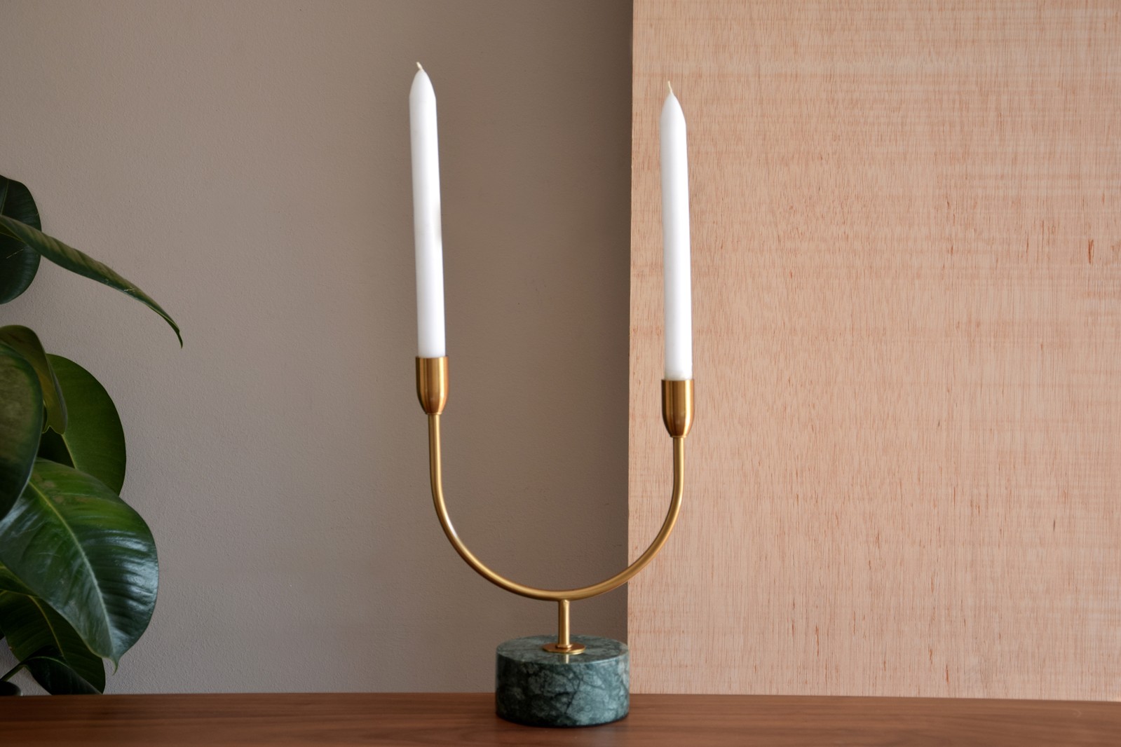 CANDELABRO PARA DOS VELAS REALIZADO EN METAL CON ACABADO LATÓN ENVEJECIDO. BASE EN MÁRMOL TONO VERDE JASPEADO. TAMAÑO PEQUEÑO