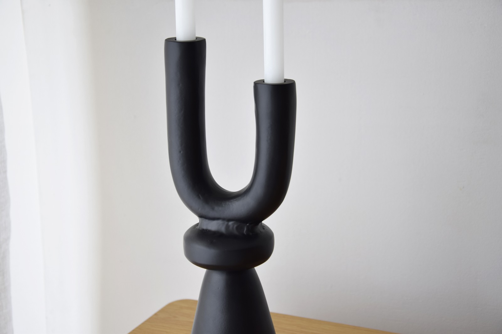 CANDELABRO REALIZADO EN ALUMINO. COLOR NEGRO. EN ESTA PIEZA LA ARTESANÍA DE SU PROCESO PRODUCTIVO SE UNE CON LA CONTEMPORANEIDAD Y SIMPLICIDAD DE SUS LÍNEAS CREANDO UN ELEMENTO DECORATIVO ÚNICO.-PARA 2 VELAS. TAMAÑO GRANDE-ESTAS PIEZAS SE REALIZAN DE MANERA ARTESANAL POR LO QUE LAS VARIACIONES DE TONALIDAD QUE PUEDAN EXISTIR ASÍ COMO CIERTAS IMPERFECCIONES PROPIAS DEL MATERIAL EMPLEADO LEJOS DE RESTAR VALOR A LA PIEZA ACENTÚAN SU CARÁCTER ARTESANAL Y ÚNICO