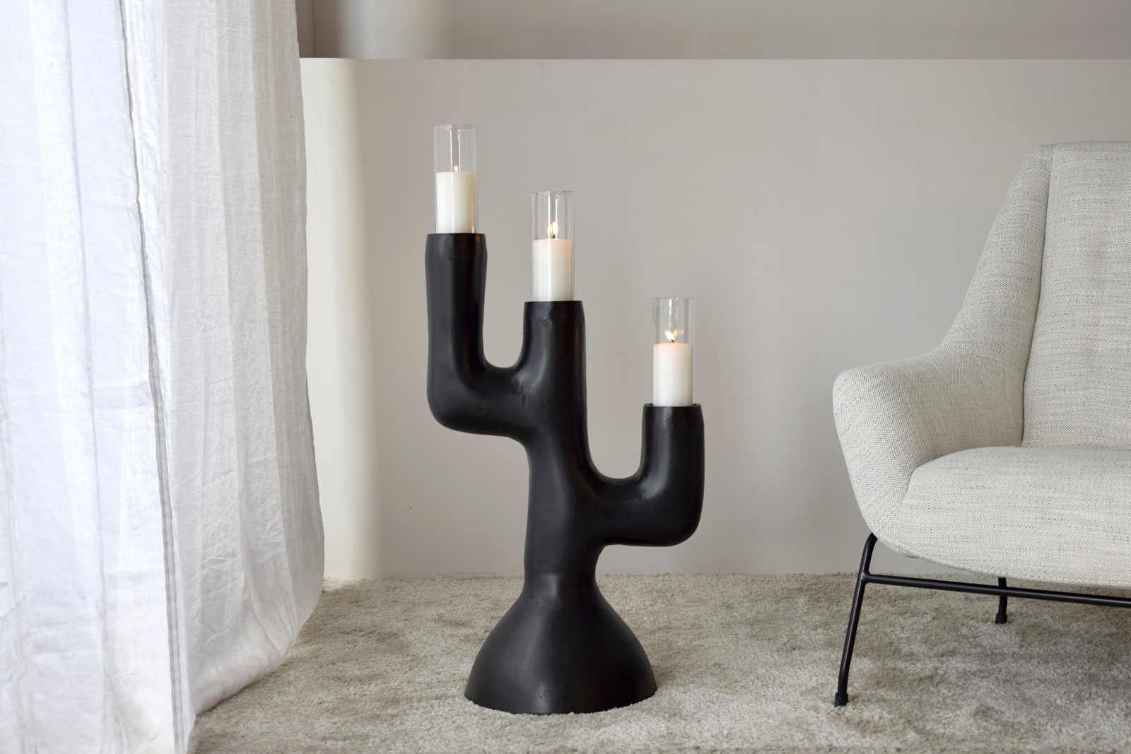 REALIZADO EN ALUMINIO. COLOR NEGRO. DE FORMAS CONTUNDENTES ESTE CANDELABRO IDEADO PARA EL SUELO SE CONVIERTE PRACTICAMENTE EN UNA ESCULTURA QUE CONJUGA LA ARTESANÍA DE SU PROCESO PRODUCTIVO CON LA CONTEMPORANEIDAD DE SU ACABADO CREANDO UN ELEMENTO DECORATIVO ÚNICO.-SOPORTE PARA 3 VELAS.-INCLUYE 3 POTECTORES EN VIDRIO PARA VELA. MEDIDAS: DIA 7x20CM-ESTAS PIEZAS SE REALIZAN DE MANERA ARTESANAL POR LO QUE LAS VARIACIONES DE TONALIDAD QUE PUEDAN EXISTIR ASÍ COMO CIERTAS IMPERFECCIONES PROPIAS DEL MATERIAL EMPLEADO LEJOS DE RESTAR VALOR A LA PIEZA ACENTÚAN SU CARÁCTER ARTESANAL Y ÚNICO