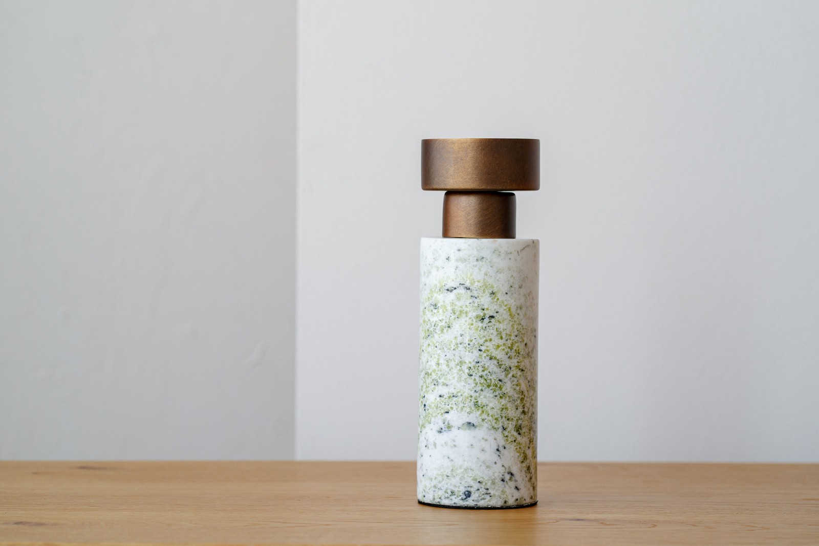 CANDELABRO CILÍNDRICO REALIZADO EN MÁRMOL NATURAL DE COLOR VERDE VETEADO EN GRIS Y BLANCO QUE SE COMBINA CON UNA PARTE METÁLICA EN ACABADO LATÓN ENVEJECIDO. TAMAÑO GRANDE.-AL TRATARSE DE PIEDRAS NATURALES Y ACABADOS ARTESANALES PUEDE HABER VARIACIÓN DE UNAS PIEZAS A OTRAS.