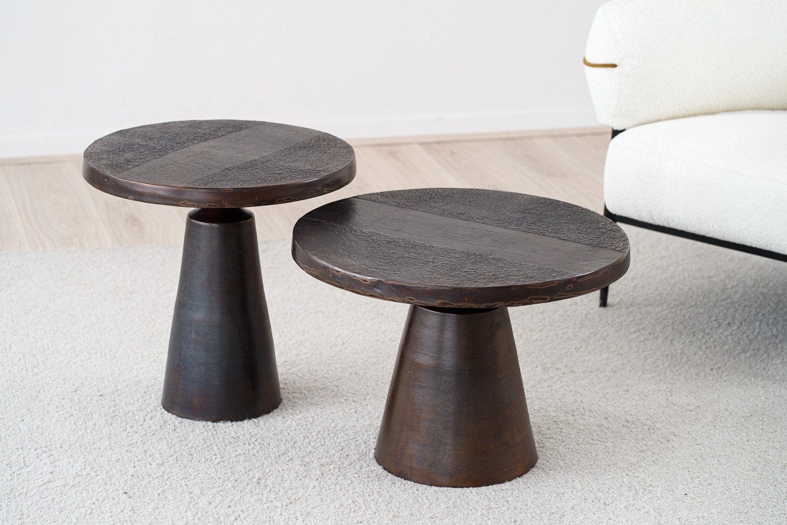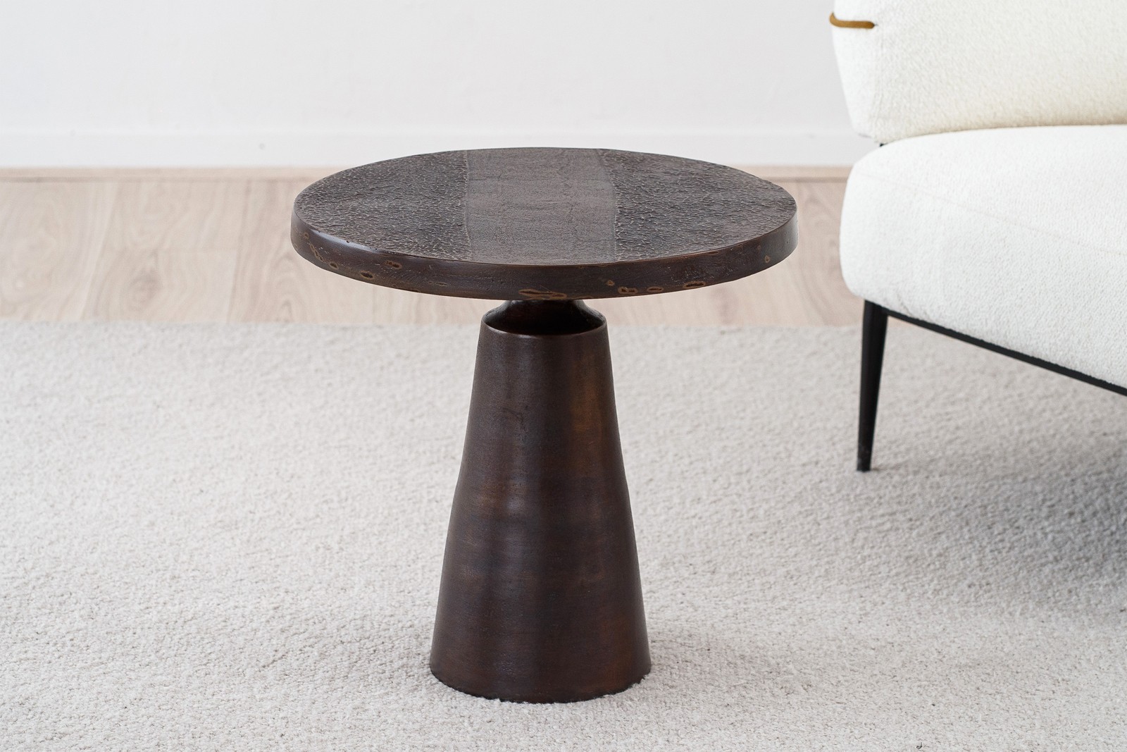 MESA AUXILIAR DE ESTÉTICA CONTEMPORÁNEA E INDUSTRIAL DE DISEÑO CÓNICO CON UN PIE CENTRAL Y TABLERO CIRCULAR. DESTACA POR SU ORGINAL ACABADO EN BRONCE ENVEJECIDO CON TONALIDADES OCRES Y UNA TEXTURA EN SUPERFICIE QUE APORTA EL CARÁCTER ARTESANAL Y ÚNICO DE CADA PIEZA. ES POSIBLE COMBINARLA CON OTRA MESA SIMILAR DE MAYOR DIAMETRO CREANDO UN CONJUNTO DE MESAS AUXILIARES CON ESTILO QUE COMPLEMENTAN SALAS DE ESTAR RINCONES DE LECTURA O CUALQUIER ESPACIO.