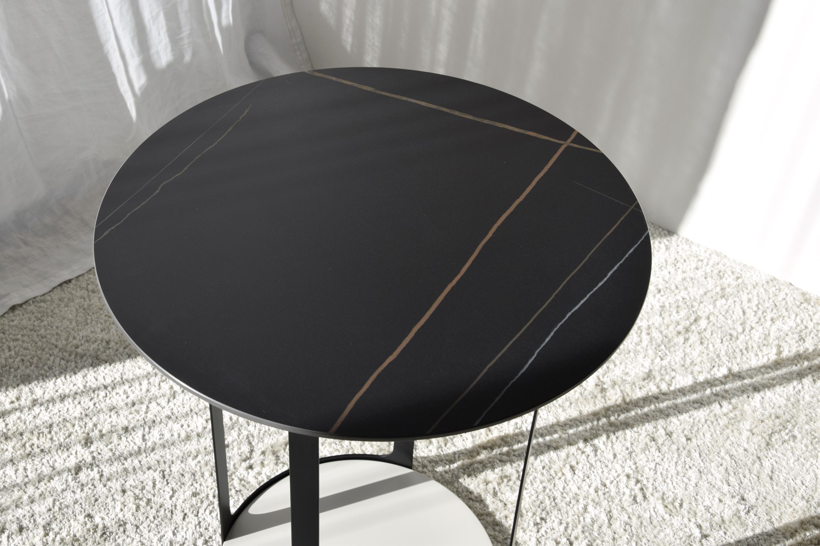 MESA AUXILIAR N.30. DE DISEÑO REDONDO EL TABLERO DE ESTA MESA ESTÁ REALIZADO EN PIEDRA SINTERIZADA DE COLOR NEGRO CON VETAS EN TONOS OCRES QUE COMBINA CON EL SUAVE GRIS ARENA DE LA BASE REALIZADA EN DM LACADO. LA ESTRUCTURA ES METÁLICA EN COLOR NEGRO DE ACABADO MATE. -REQUIERE MONTAJE-LIMPIAR CON UN PAÑO SECO