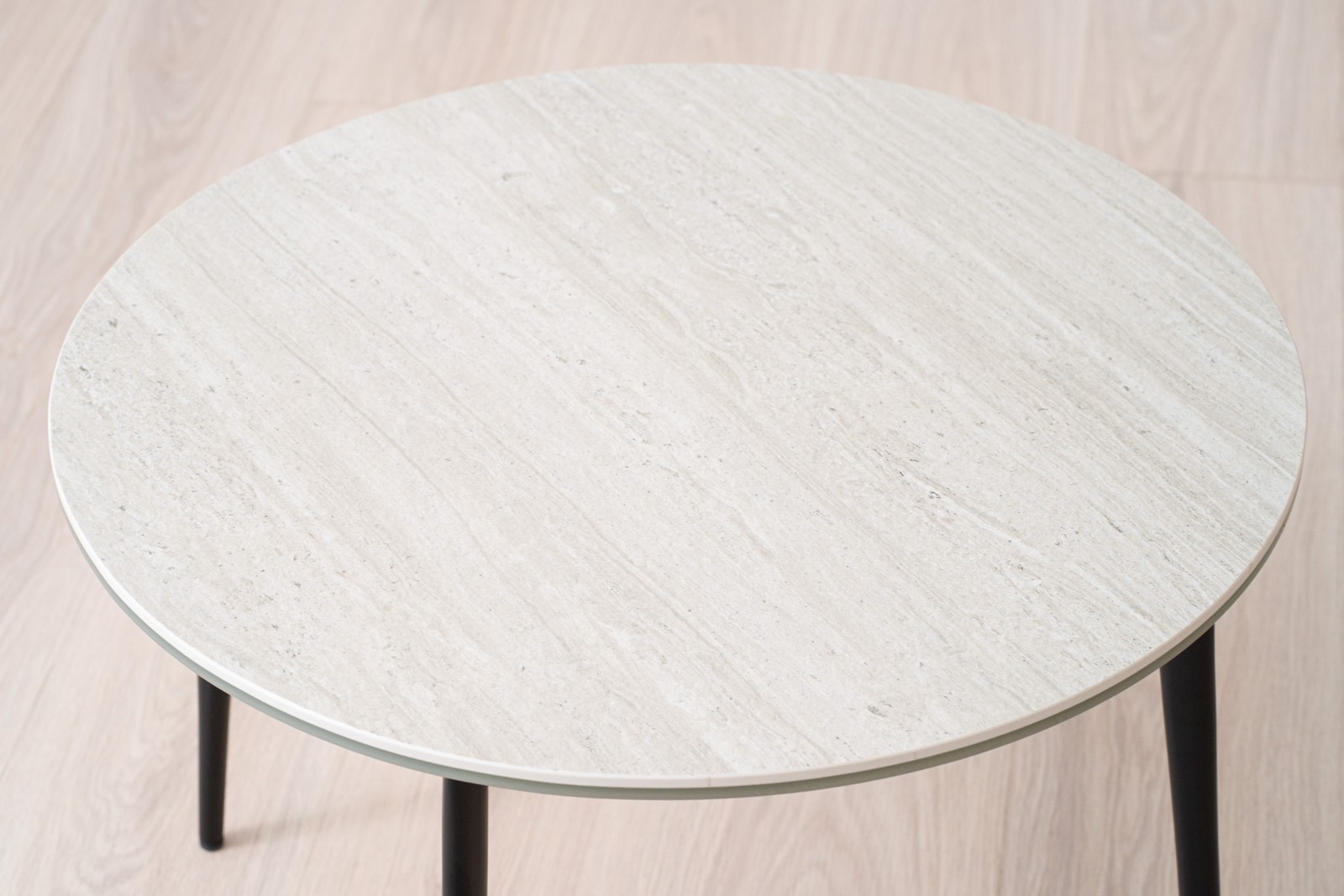 MESA AUXILIAR REDONDA CON SOBRE EN MATERIAL CERÁMICO DE 6MM DE ESPESOR COLOCADO SOBRE VIDRIO. EL ACABDO CERÁMCIO ES EN COLOR GRIS MATE CON TEXTURA SIMULANDO UN MÁRMOL TRAVERTINO.LAS PATAS ESTÁN REALIZADAS EN METAL COLOR NEGRO DE ACABADO MATE Y VAN ADELGAZANDO DESDE LA PARTE SUPERIOR A LA INFERIOR.COMBINA CON UNA MESA DE MAYOR ALTURA Y CON TAPA EN MADER ANATURAL HACIENDO UN CONJUNTO DE MESAS DE ESTÉTICA NATURAL Y SOFISTICADA A LA VEZ POR SU DISEÑO.