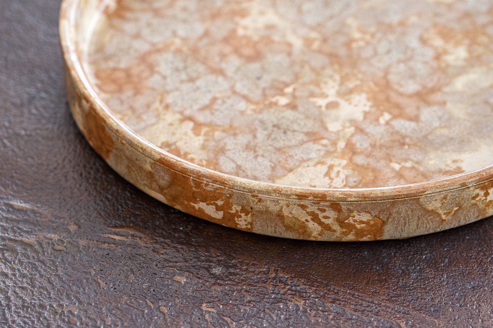 CENTRO DE MESA COLECCIÓN NELA. TAMAÑO PEQUEÑO. CENTRO REDONDO REALIZADO EN BARRO EN EL QUE SE COMBINAN TONOS AMARILLO DORADO BEIGE Y GRIS EN SU VIDRIADO. EL VIDRIADO NO LLEGA A CUBRIR LA PIEZA POR COMPLETO DEJANDO ESPACIOS DONDE SE PERCIBE LA RUGOSIDAD DE LA PASTA CERÁMICA NATURAL. EL DECORADO DE ESTAS PIEZAS SE REALIZA A MANO POR LO QUE EL PROCESO DE VIDRIADO ES DIFERENTE EN CADA UNA Y LOS VIDRIOS EMPLEADOS REACCIONAN DE MANERA DIFERENTE EN EL HORNO DE COCCIÓN LO QUE APORTA A CADA PIEZA UN CARÁCTER ÚNICO Y DISTINTO. -DADO EL CARÁCTER ARTESANAL DE ESTAS PIEZAS Y LO ESPECIAL DE SU VIDRIADO ES POSIBLE QUE HAYA VARIACIONES DE COLOR Y ACABADO.