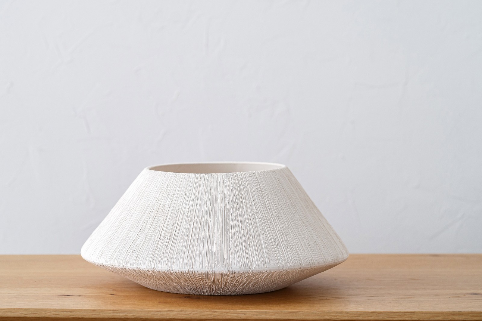 CENTRO DE MESA COLECCIÓN EINÉS. LA COLECCIÓN EINÉS ES UNA COLECCIÓN DE PIEZAS REALIZADAS EN CERÁMICA DE DISEÑO GEOMÉTRICO QUE SE VE REFORZADO POR LAS LÍNEAS QUE SURCAN LA SUPERFICIE DE LAS PIEZAS Y QUE SE REALIZAN MANUALMENTE EN CADA UNA DE ELLAS EN UN ENCUENTRO ENTRE LA ARTESANÍA DEL PROCESO DE PRODUCCIÓN Y LAS LÍNEAS GEOMÉTRICAS Y CONTEMPORÁNEAS DEL DISEÑO. SU COLOR EN EL TONO NATURAL DE LA PASTA CERÁMICA CON ACABADO MATE HACEN QUE ESTA COLECCIÓN SEA PERFECTA PARA CUALQUIER ESPACIO.