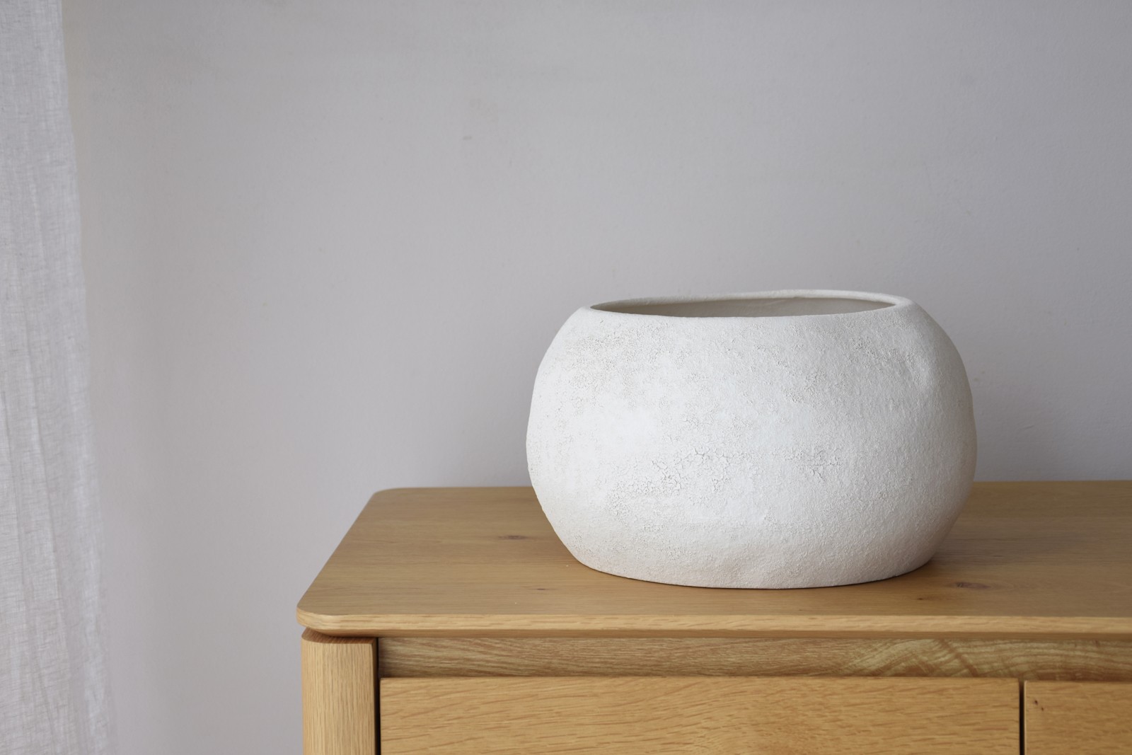 CENTRO DE MESA REALIZADO EN CERÁMICA EN COLOR BLANCO CÁLIDO CON UNA SUAVE TEXTURA DE ARENA APLICADA A MANO. UNA PIEZA DE DISEÑO SENCILLO Y CON VOLUMEN DE FORMA REDONDEADA Y PERFECTA PARA DECORAR CUALQUIER ESPACIO. DEBIDO A SU PROCESO DE PRODUCCIÓN PUEDE HABER VARIACIONES DE TEXTURA EN LA PIEZA Y DE UNAS PIEZAS A OTRAS YA QUE SE TRATA DE UNA PRODUCCIÓN ARTESANAL.