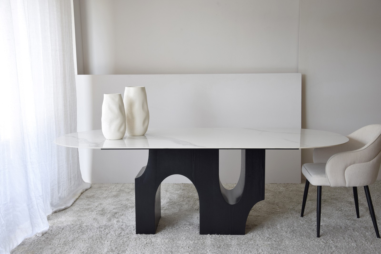 MESA DE COMEDOR PETRA CON SOBRE REALIZADO EN MATERIAL CERÁMICO DE 12 MM DE ESPESOR DE ACABADO MÁRMOL EN COLOR BLANCO VETEADO EN TONOS GRISES. LA BASE ESTÁ FORMADA POR UNA PIEZA DE DISEÑO ESCULTÓRICO A LA QUE APORTA GRAN LIGEREZA EL VACÍO DE LOS HUECOS QUE LA ATRAVIESAN. REALIZADA EN DM RECHAPADO EN FRESNO NATURAL TEÑIDO EN COLOR NEGRO DE ACABADO MATE QUE DEJA VISTA LA VETA PROPIA DE LA MADERA. LOS TONOS Y PATRONES DEL MATERIAL UTILIZADO EN EL SOBRE PUEDEN SER DIFERENTES DE UNAS PIEZAS A OTRAS.CERÁMICO N1